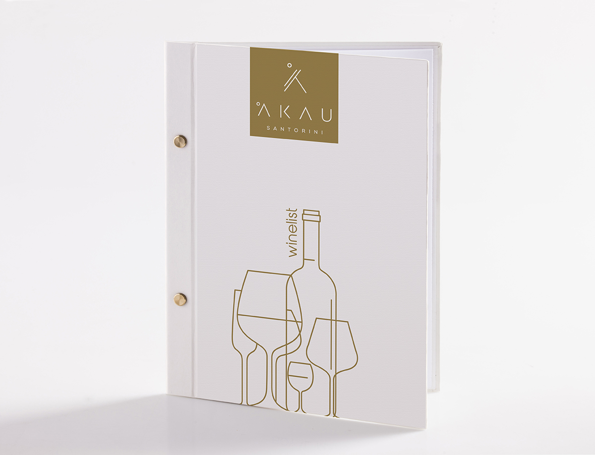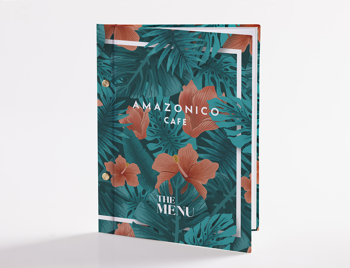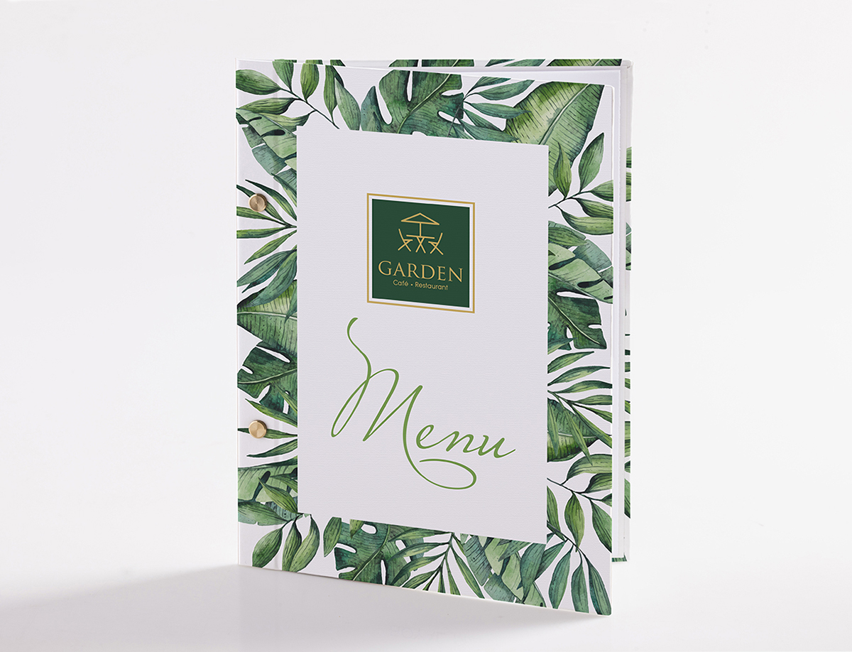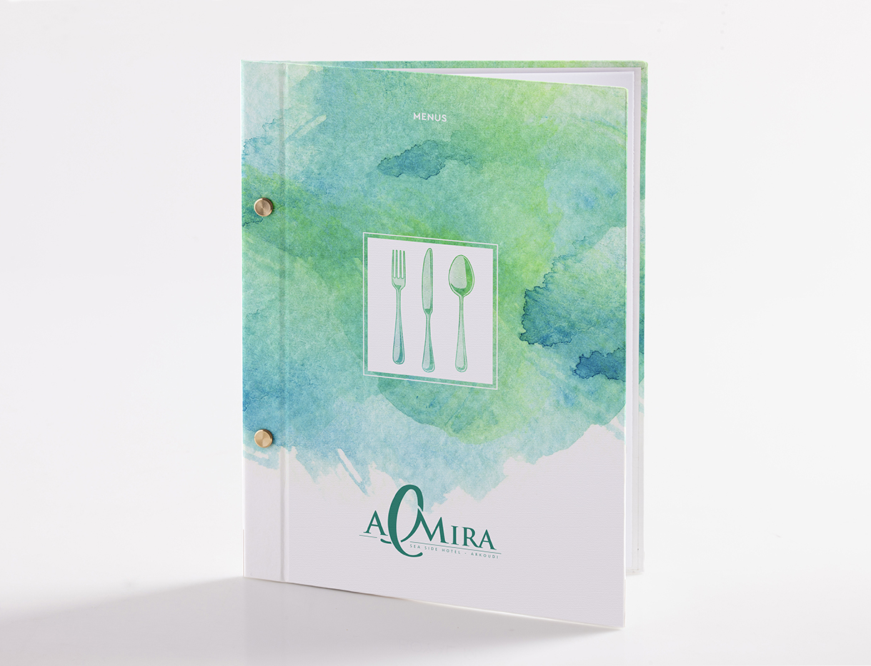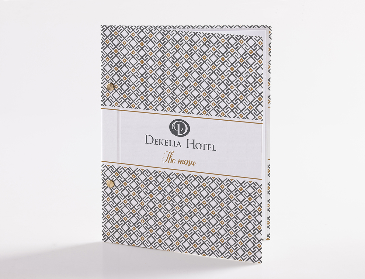 - Handmade cataloque menus bound in thick cardboard, dressed with printed paper and mat lamination.