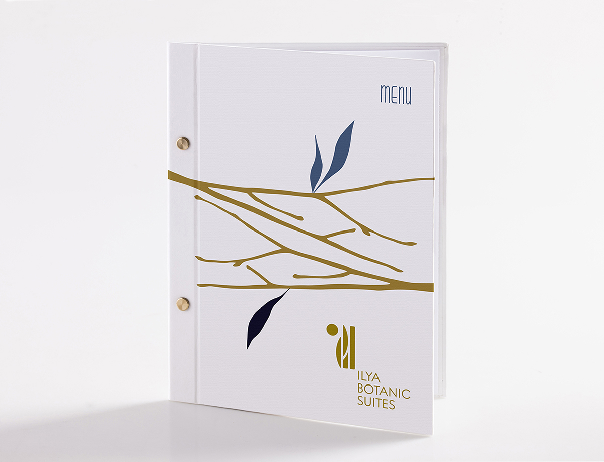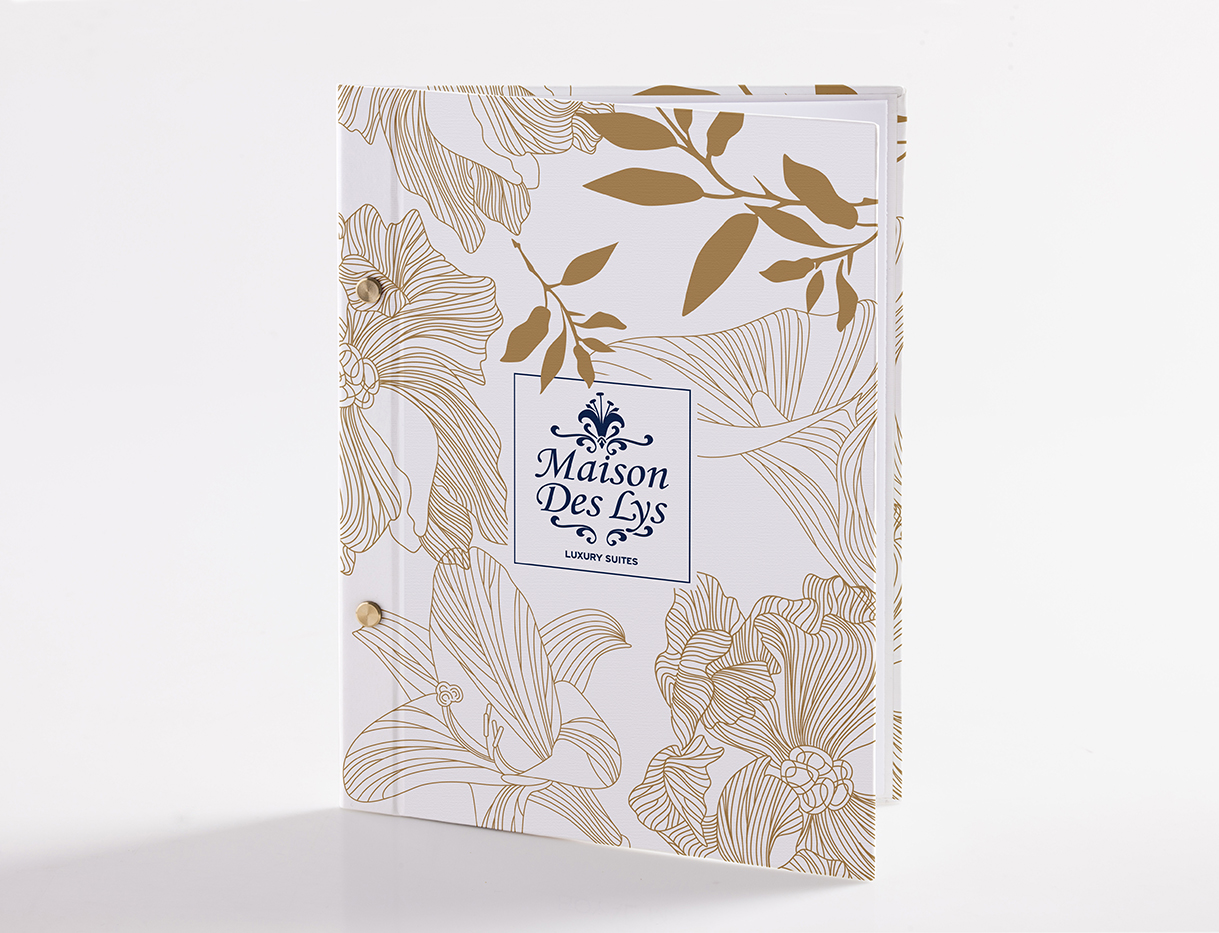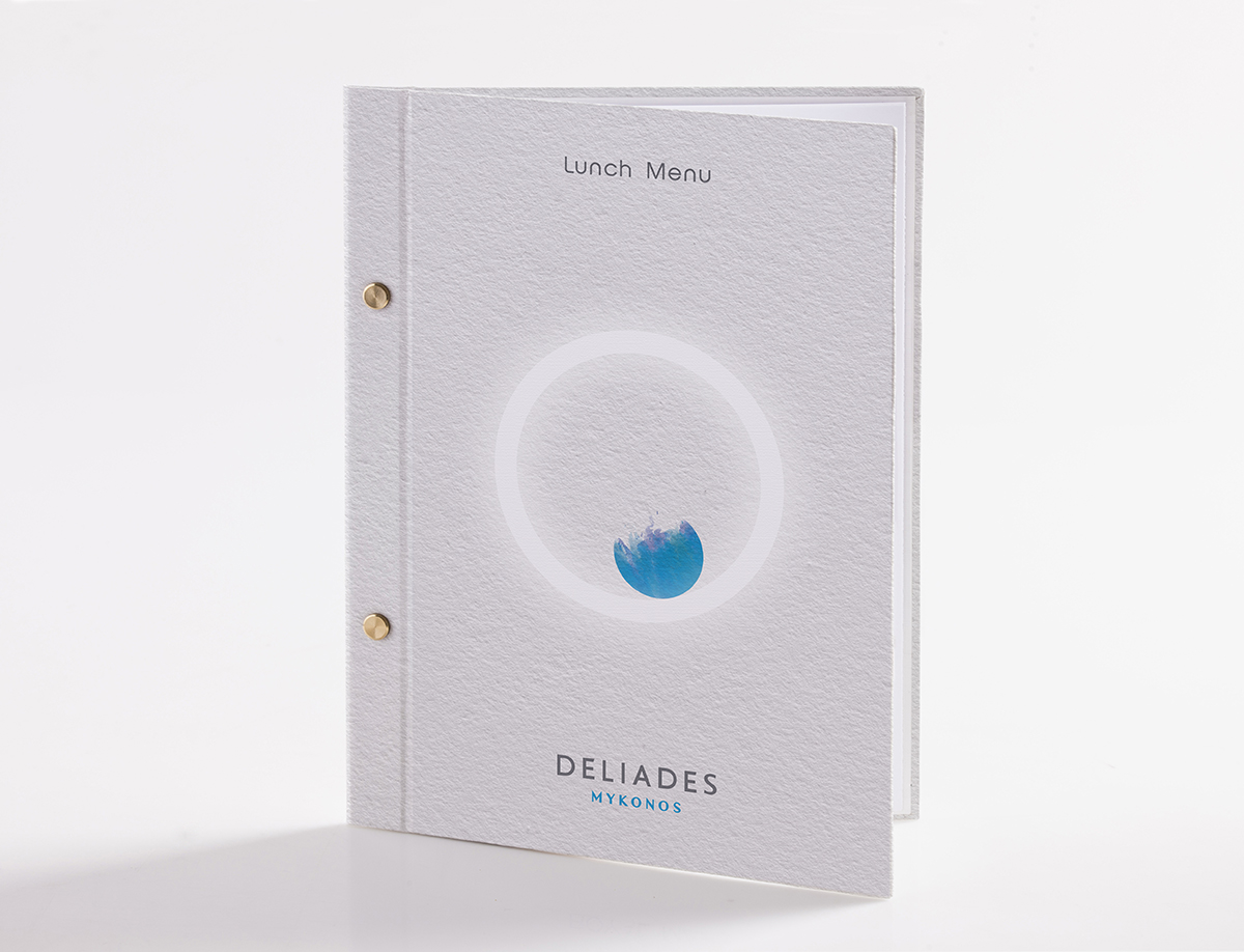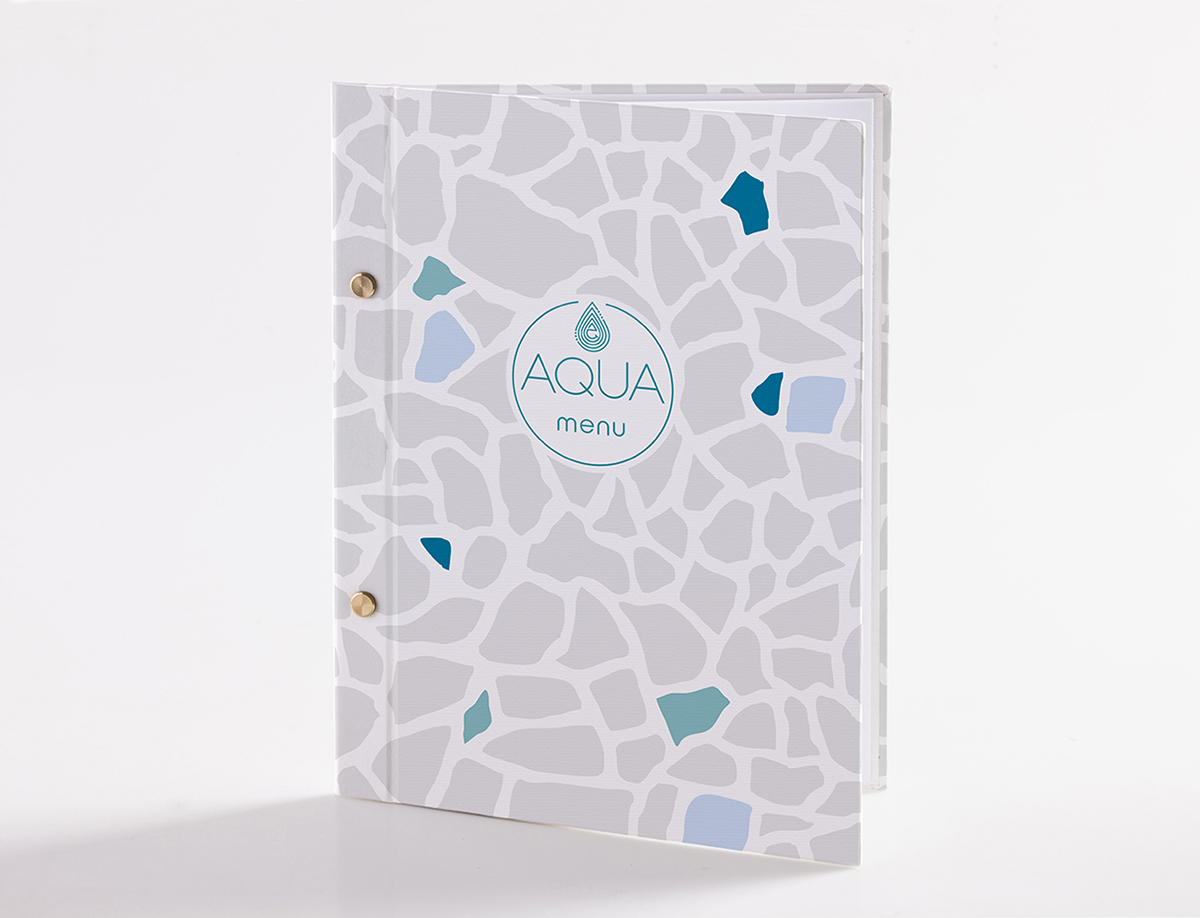 - Handmade cataloque menus bound in thick cardboard, dressed with printed paper and mat lamination.