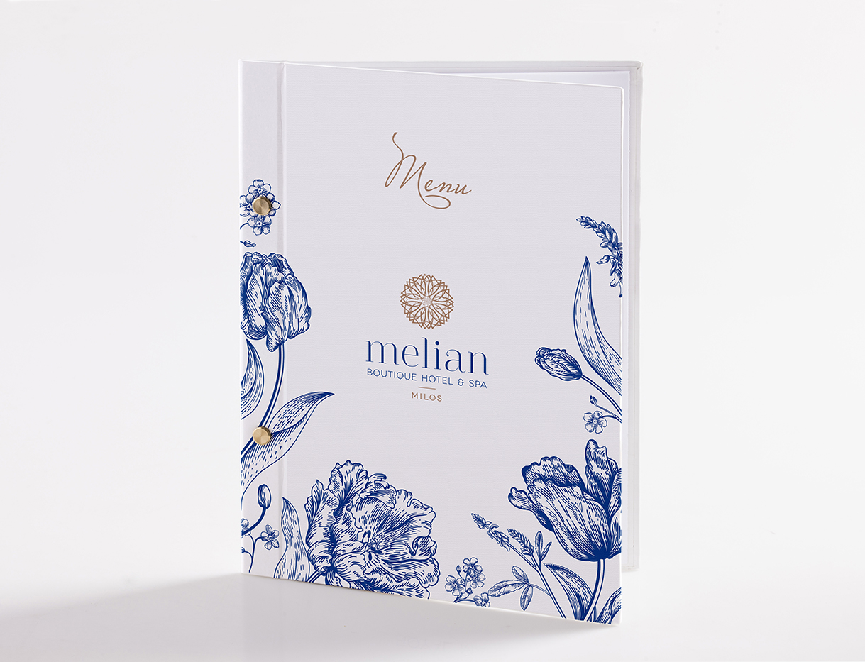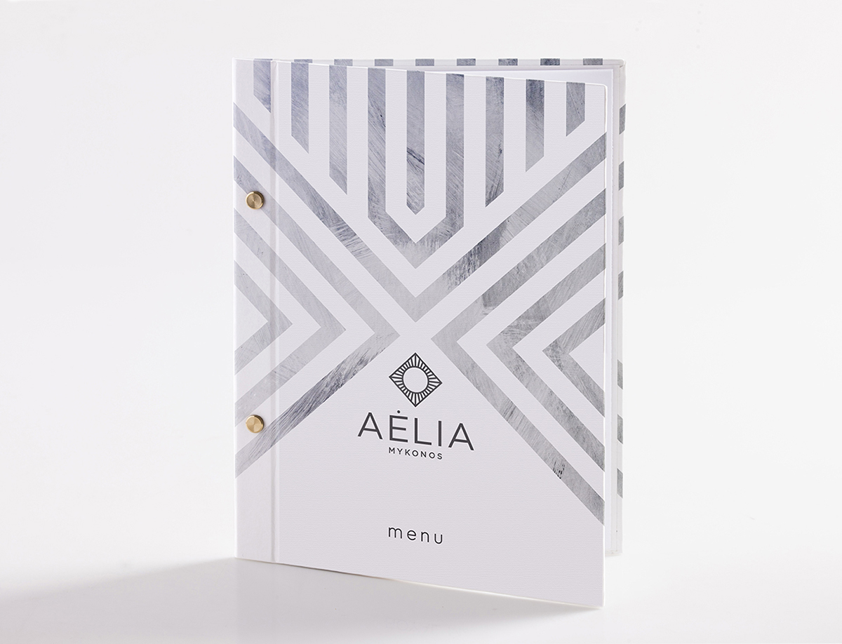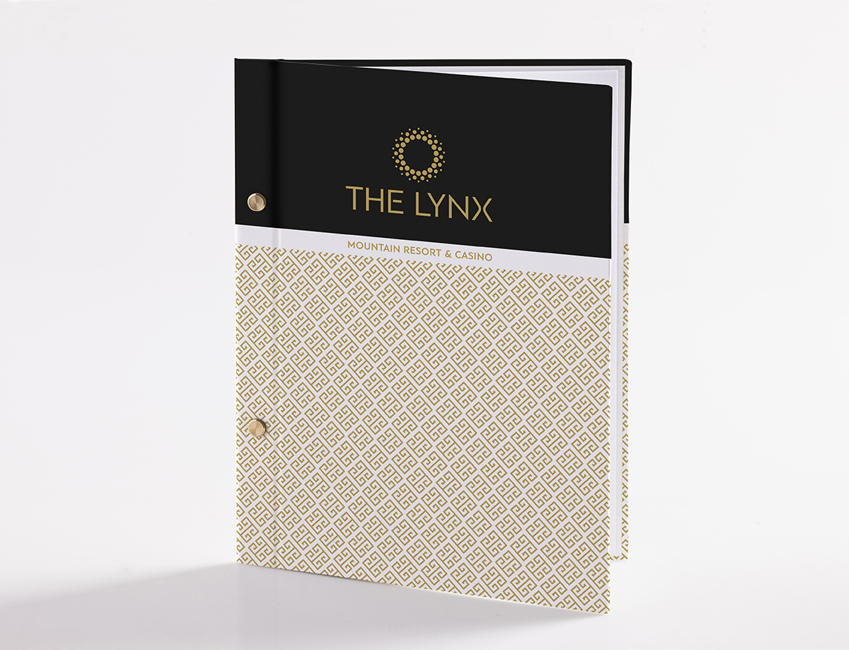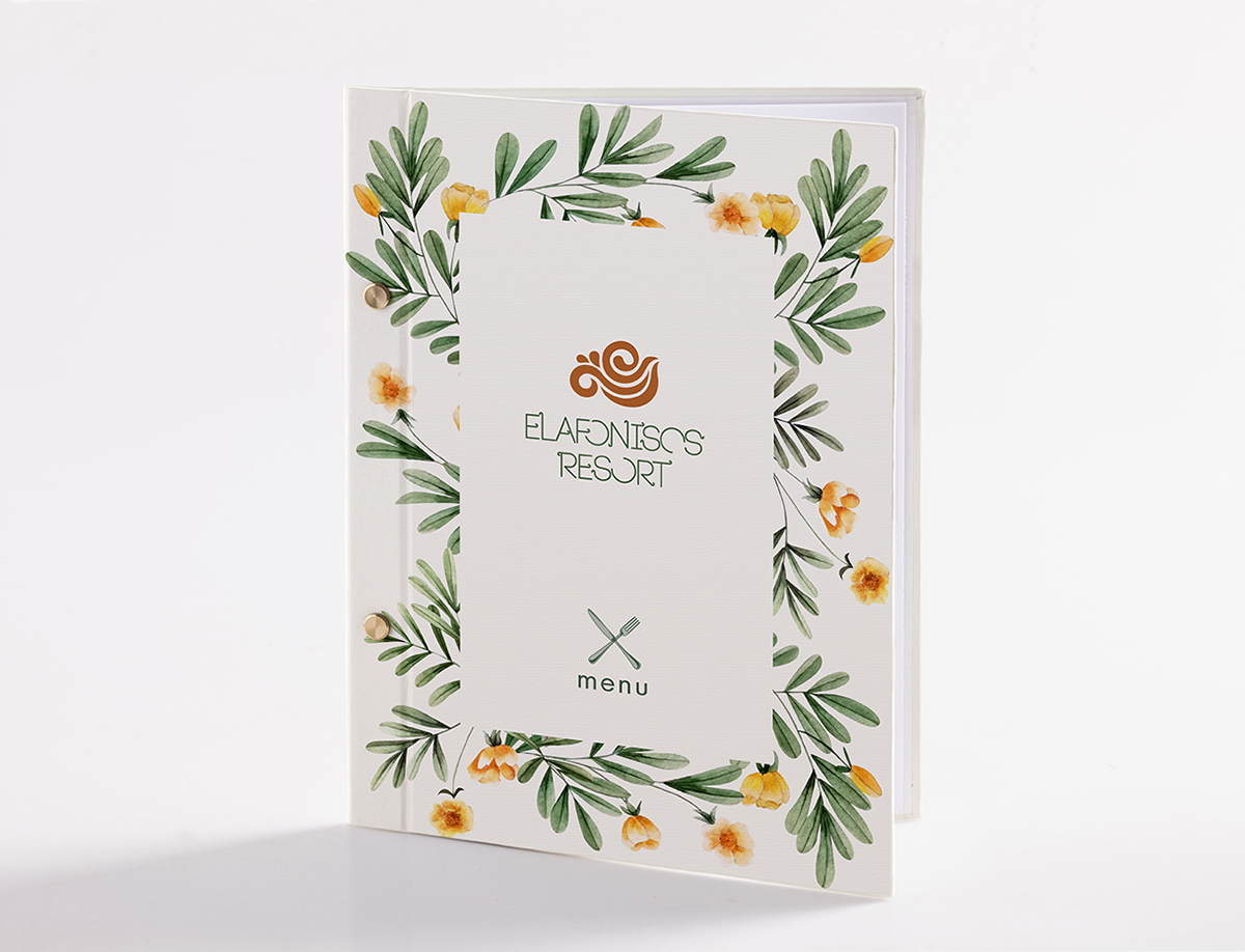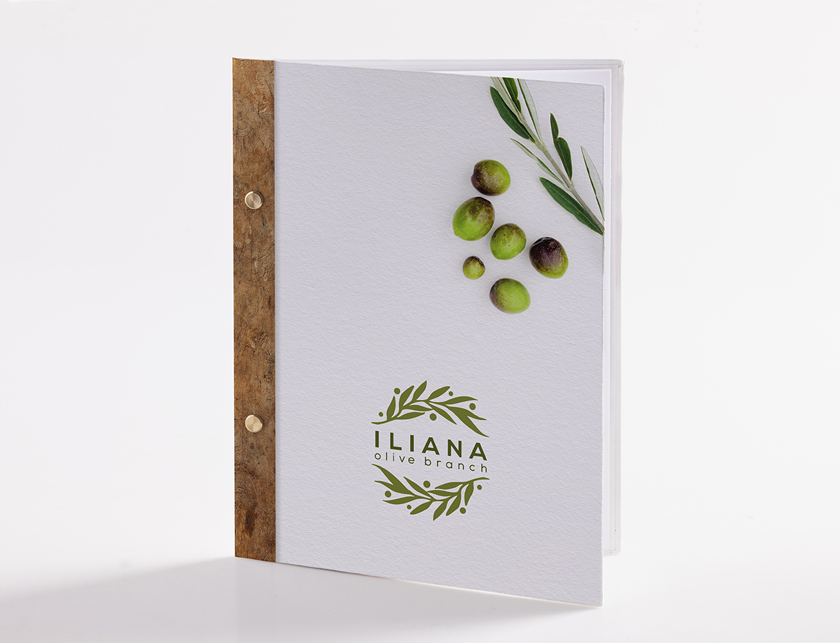 - Handmade cataloque menus bound in thick cardboard, dressed with printed paper and mat lamination.
